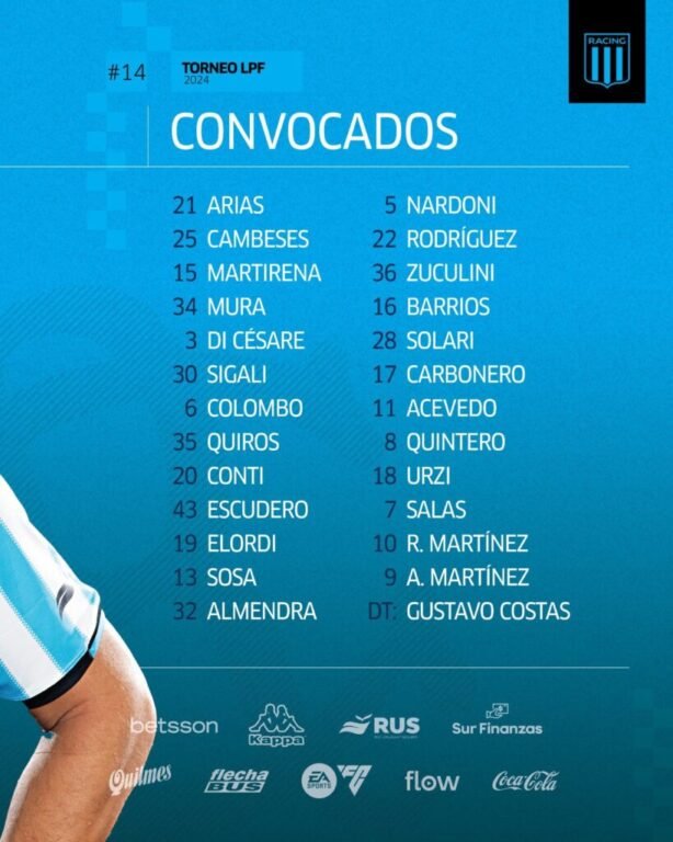 Racing Club: Gabriel Arias; Facundo Mura, Marco Di Cesare, Leonardo Sigali, Santiago Quirós; Juan Nardoni, Santiago Sosa, Baltasar Rodríguez o Agustín Almendra; Johan Carbonero, Adrián Martínez y Roger Martínez. DT: Gustavo Costas