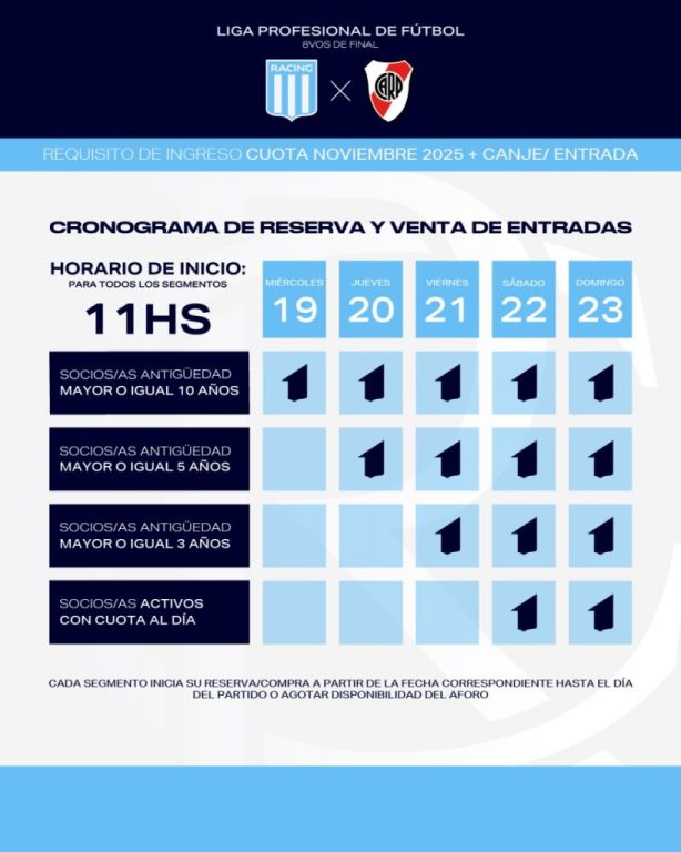 Durante las últimas horas de este martes, Racing dio a conocer el cronograma de reserva para que los socios y socias del club puedan obtener su lugar para el clásico ante River que se jugará el próximo lunes desde las 19:15 horas en el estadio Presidente Perón. El mismo dará comienzo en el día de hoy.