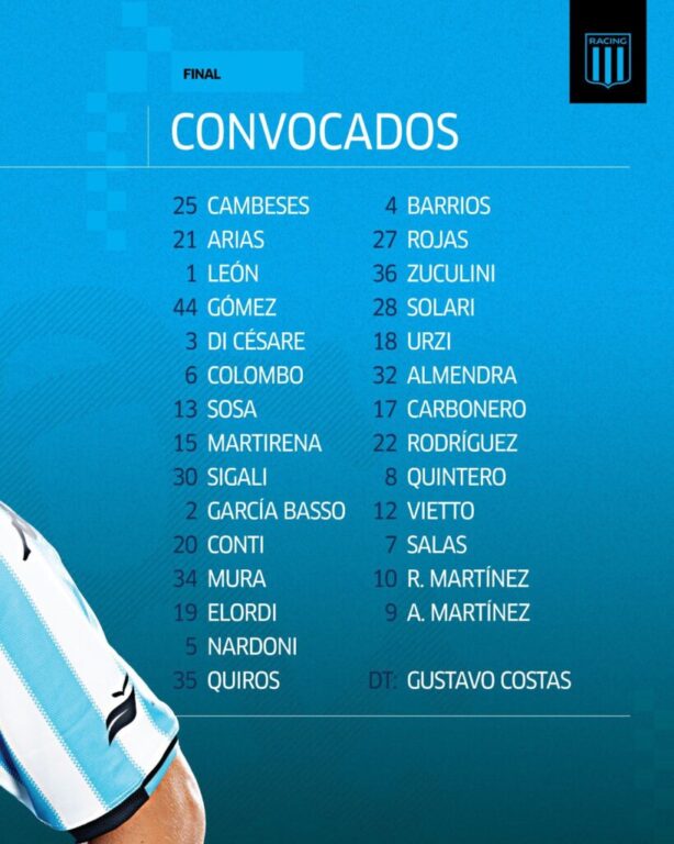 Racing Club: Gabriel Arias; Gastón Martirena, Marco Di Cesare, Santiago Sosa, Agustín García Basso, Gabriel Rojas; Juan Nardoni, Agustín Almendra; Juan Fernando Quintero; Maximiliano Salas y Adrián Martínez. DT: Gustavo Costas.